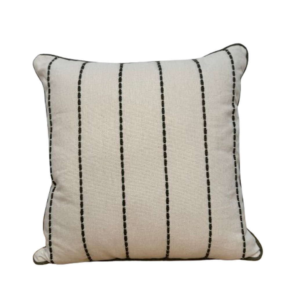 O linho cru, reconhecido por sua textura nobre e durabilidade, eleva o padrão da peça, enquanto o bordado cuidadosamente executado evidencia o trabalho artesanal e a atenção aos detalhes — características que tornam cada almofada única.