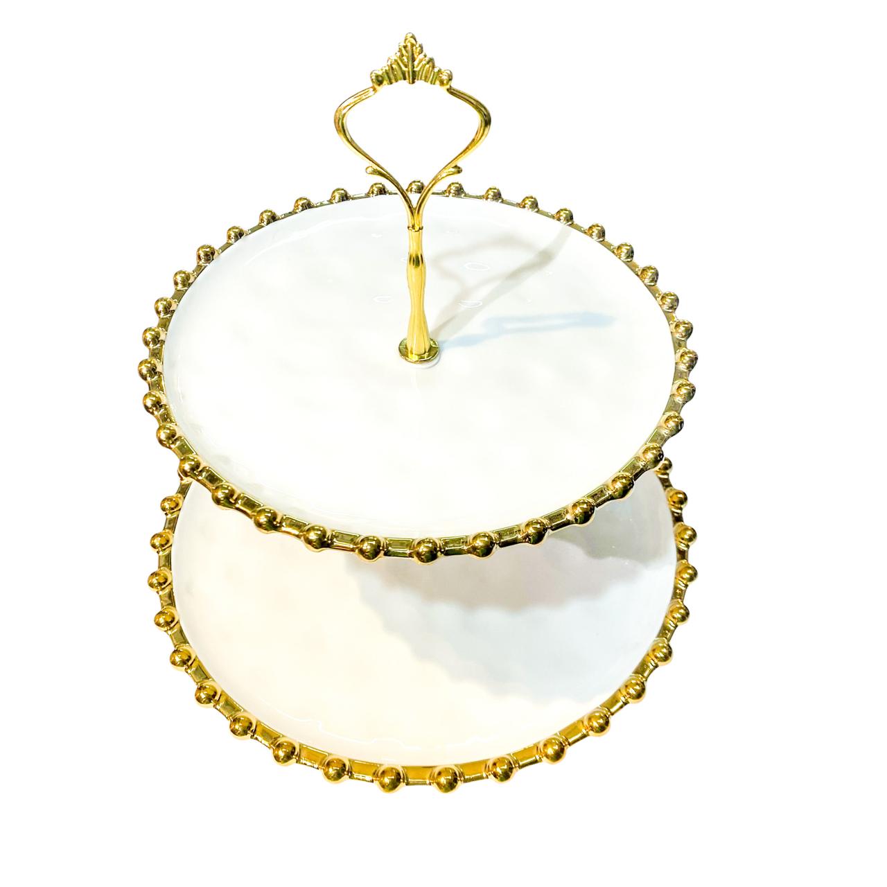 A Bandeja em Cerâmica de 2 Andares com Filete Dourado é uma peça elegante e funcional que eleva a decoração da sua mesa com muito charme. Produzida em cerâmica de alta qualidade, apresenta acabamento refinado com filete dourado nas bordas, trazendo um toque sofisticado e delicado ao ambiente.