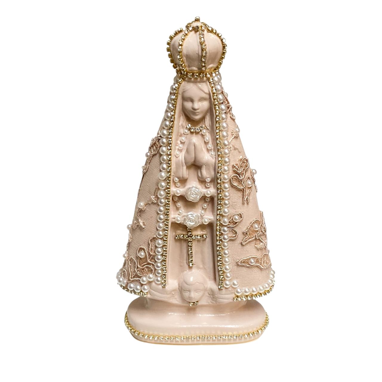 A imagem de Nossa Senhora Aparecida com renda trabalhada é uma peça de fé e beleza que encanta pela delicadeza dos detalhes. Produzida com acabamento fino e textura que remete à renda artesanal, ela traz um toque de sofisticação e serenidade ao ambiente. A tonalidade café confere um visual acolhedor e elegante, perfeito para composições em tons terrosos ou decorações de estilo rústico e clássico.