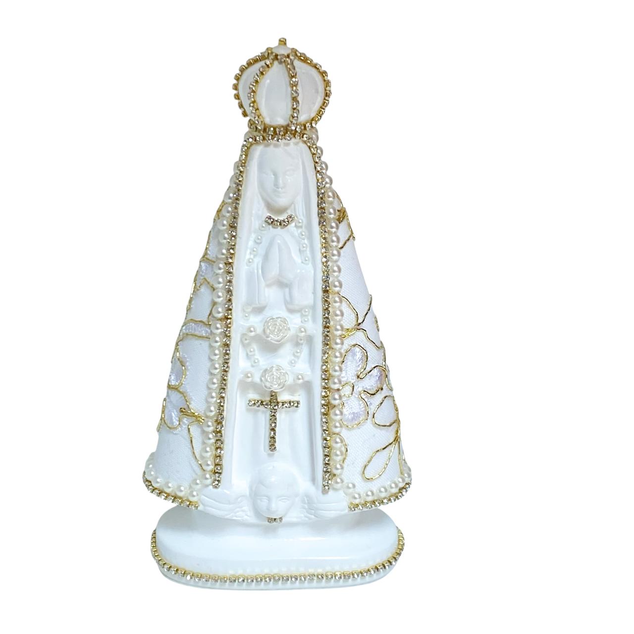 A escultura de Nossa Senhora Aparecida branca com renda bordada em dourado, é uma peça que transmite devoção, beleza e proteção. Com acabamento delicado e toque sofisticado, é perfeita para compor ambientes de fé e espiritualidade, seja em casas, capelas, salas de oração ou como presente religioso.