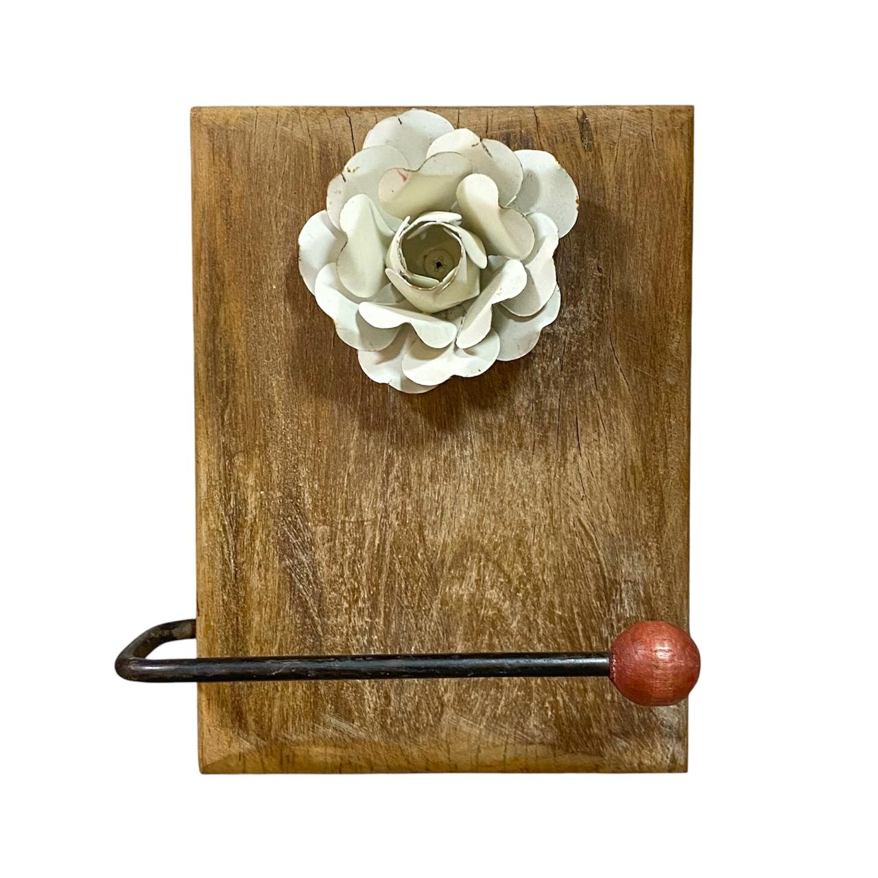 GANCHO RUSTICO MADEIRA DE PEROBA COM FLOR DE METAL BRANCA