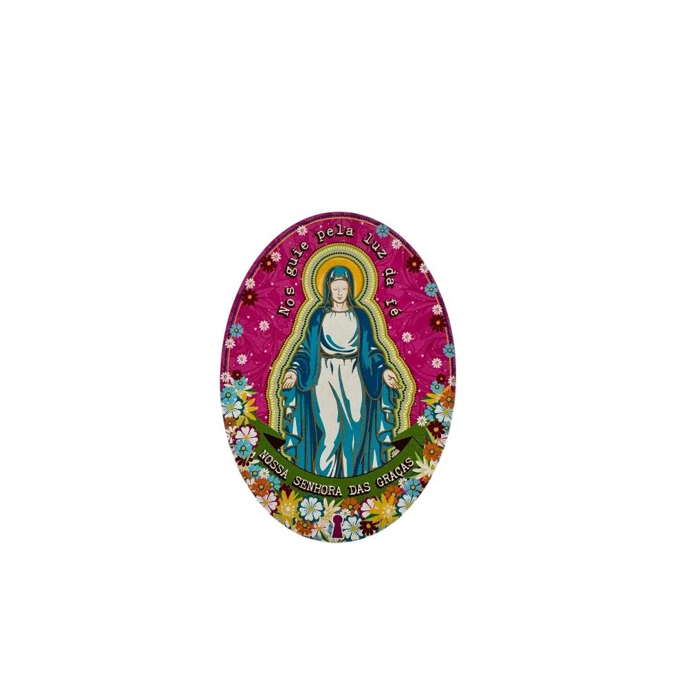 Com 9x6,5x1cm, é compacto e versátil, ideal para fixar bilhetes, fotos ou recados em geladeiras, quadros metálicos ou painéis imantados, trazendo um toque de espiritualidade para os ambientes.
