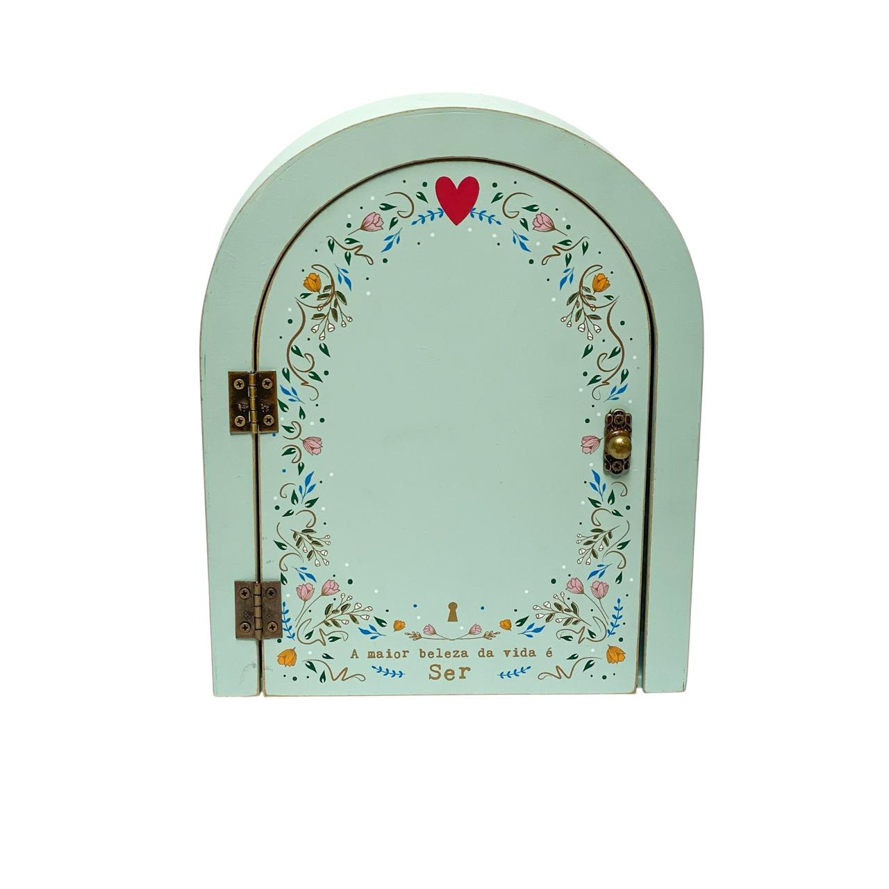 Com dimensões 24,5x20x5,5 cm, oferece espaço ideal para pendurar chaves, acessórios, cartões, pequenos objetos e até lembranças diárias. O espelho embutido na “portinha” adiciona delicadeza, enquanto a mensagem “Maior Beleza da Vida” leva positividade e acolhimento ao ambiente.