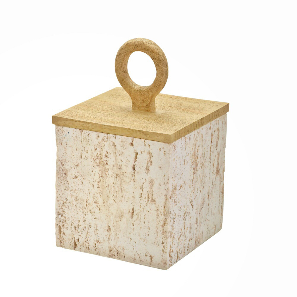 Potiche decorativo em resina com acabamento elegante nas cores branco e marrom. Seu formato quadrado com tampa e alca superior traz um visual sofisticado e moderno, perfeito para compor ambientes com charme e funcionalidade.