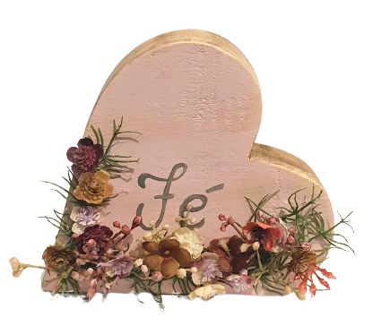 Coracao de Madeira para mesa com flores artificiais Fe rosa
