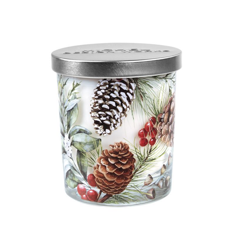 Aroma fresco de ciprestes e uma estampa em verdes, pinhas e frutas vermelhas são um complemento perfeito para qualquer decoração de Natal.