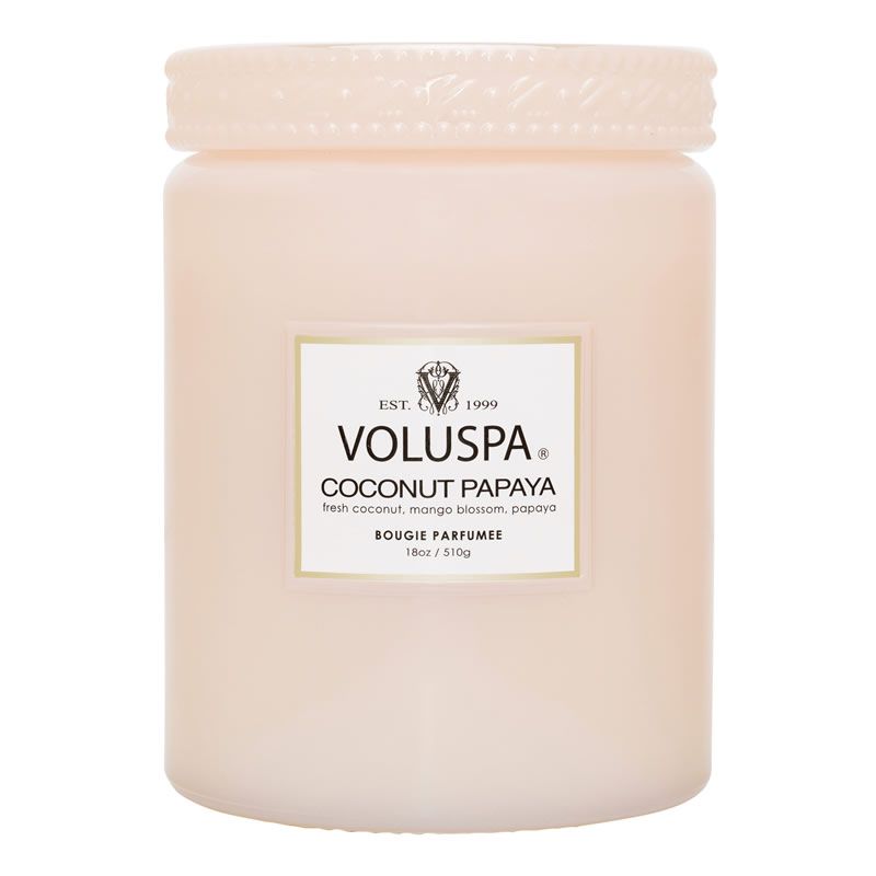 _x000D_Buscando refúgio do calor incessante, sob um pequeno guarda-sol de cana, uma deliciosa bebida de frutas foi oferecida. Esta mistura de papaia doce e suculenta, pêssegos brancos e frutas tropicais é servida quase congelada em uma casca de coco. Tudo rodeado de flores tropicais, perfumando docemente cada gole gelado, criando uma memória tão inesquecível, que foi a inspiração para a criação da fragrância VOLUSPA Coconut Papaya... Queime para manter a calma.