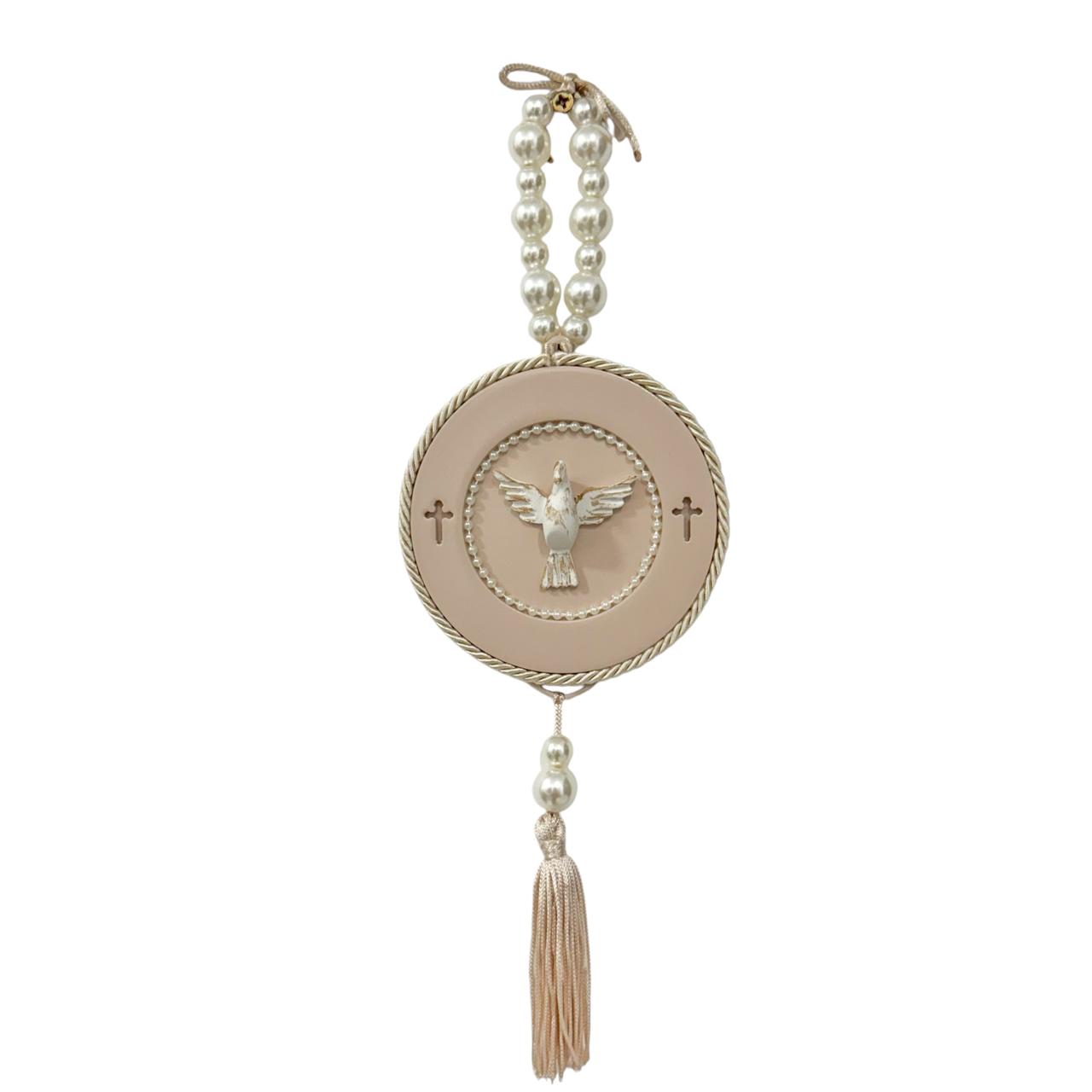 O adorno é finalizado com uma delicada aplicação de pérolas e um elegante pingente que proporciona leveza e movimento. Ideal para portas, entradas, corredores e ambientes que pedem um toque de fé com bom gosto. Excelente também como lembrança para ocasiões religiosas e presente especial.