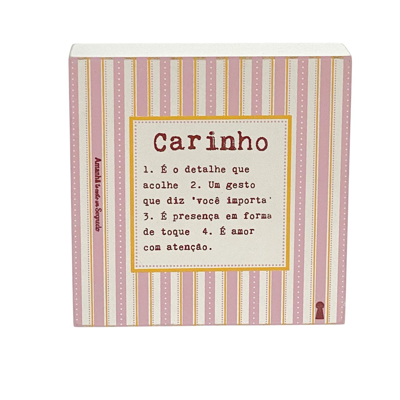 O Box Decorativo “Carinho – Significado” em MDF é uma peça delicada e afetiva, criada para transmitir acolhimento e a beleza dos gestos simples que tocam o coração. Com mensagem suave e cheia de significado, ele lembra que o carinho está presente nos pequenos detalhes do dia a dia — nos abraços, nas palavras gentis e nas memórias que confortam.