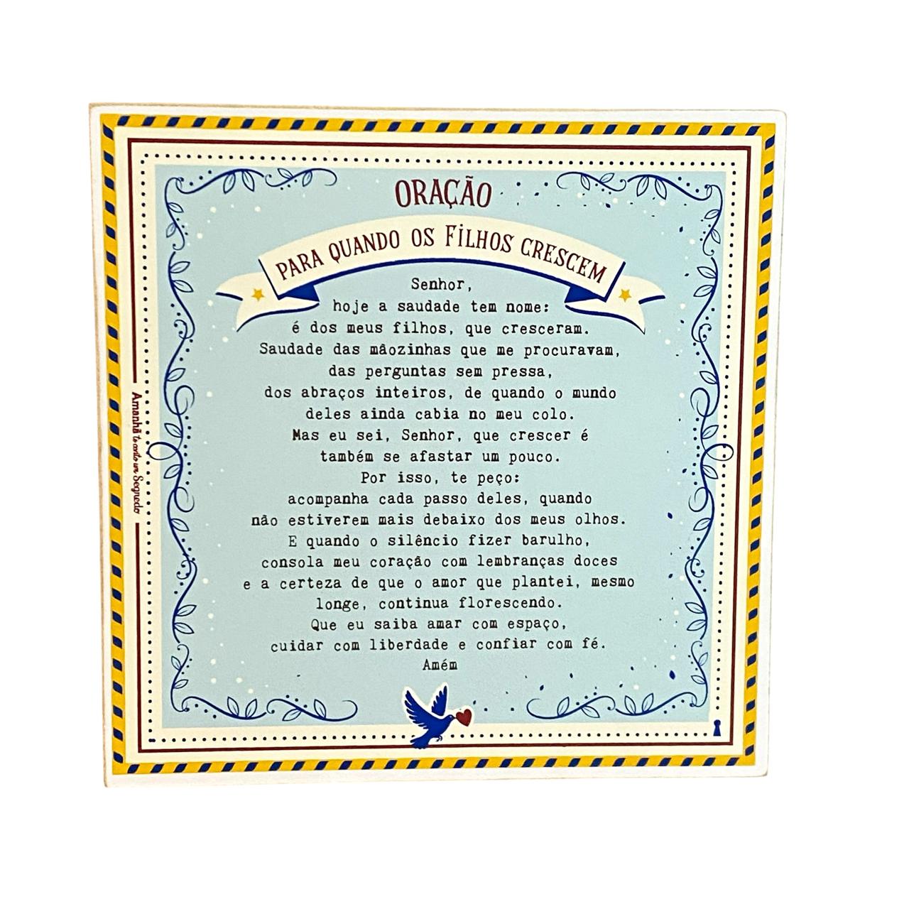 O Quadro Box “Oração – Filhos Crescem” é uma peça decorativa cheia de amor e significado, criada para tocar o coração de pais e mães. Produzido em MDF de alta qualidade, possui acabamento resistente, arte em alta definição e uma mensagem emocionante que fala sobre a jornada, o cuidado e a bênção que é ver os filhos crescerem.