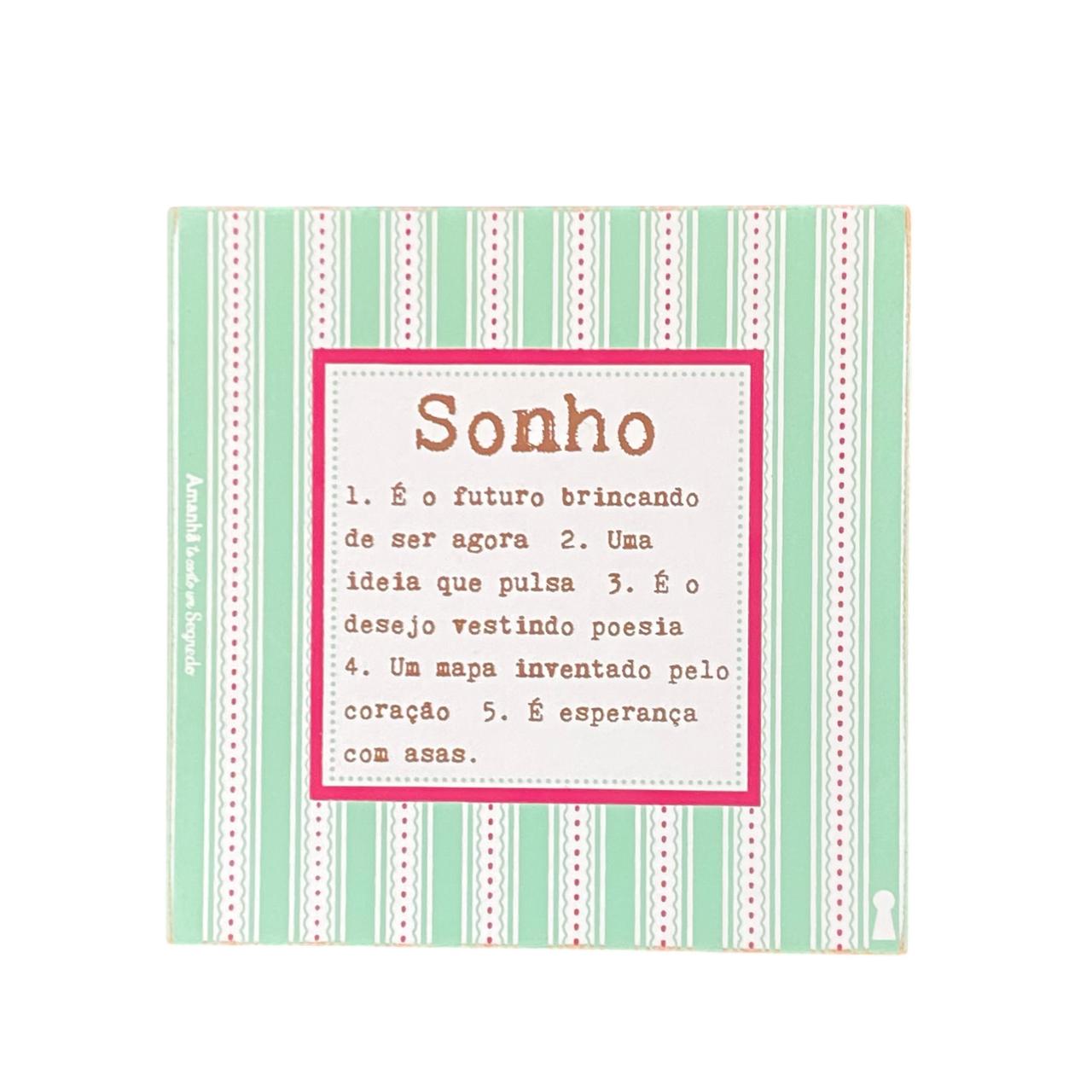 Com tamanho 12x12x3,5 cm, é ideal para decorar mesas, nichos, prateleiras, estantes ou compor uma parede afetiva. Sua mensagem sobre “sonho” convida a cultivar esperança, imaginação e propósito no dia a dia.