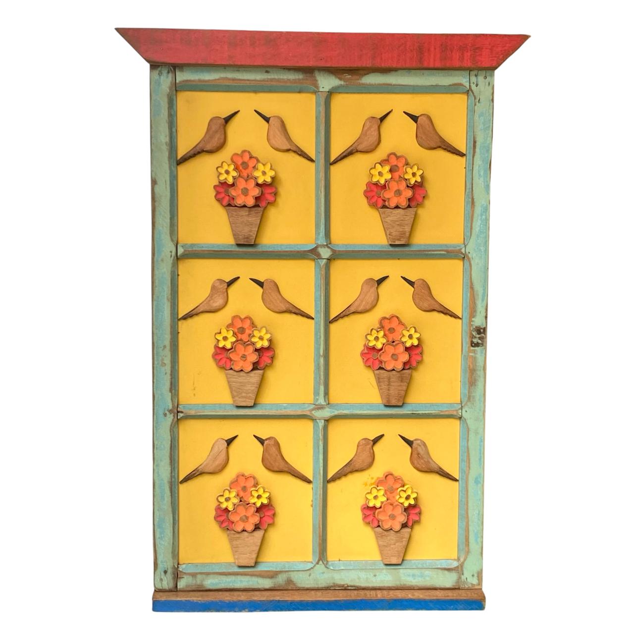 Cada nicho exibe delicadas aplicações em relevo com pássaros em madeira e vasos florais coloridos, criando uma composição acolhedora e cheia de vida. Os detalhes entalhados e pintados manualmente valorizam o trabalho artesanal e tornam cada peça única.