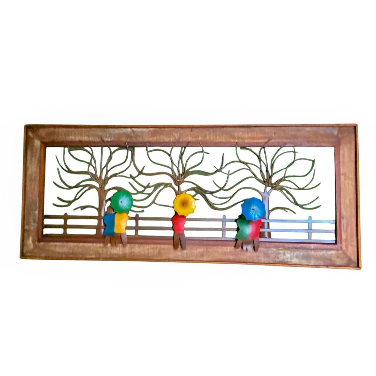 Leve arte, cor e delicadeza para sua decoração com este encantador painel decorativo em metal. A peça retrata uma cena poetica com casais sob arvores estilizadas, segurando guarda chuvas coloridos, criando uma composição cheia de charme, romantismo e personalidade.