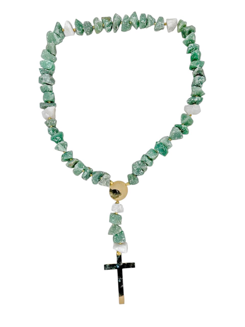 Produzido com Quartzo Verde natural, cada pedra possui brilho proprio, textura organica e tonalidade verde suave, deixando a peca harmoniosa e acolhedora. A cruz metalica finaliza o terco com elegancia e delicadeza, tornando-o ideal para altares, salas, quartos, halls de entrada e cantinhos de oracao.
