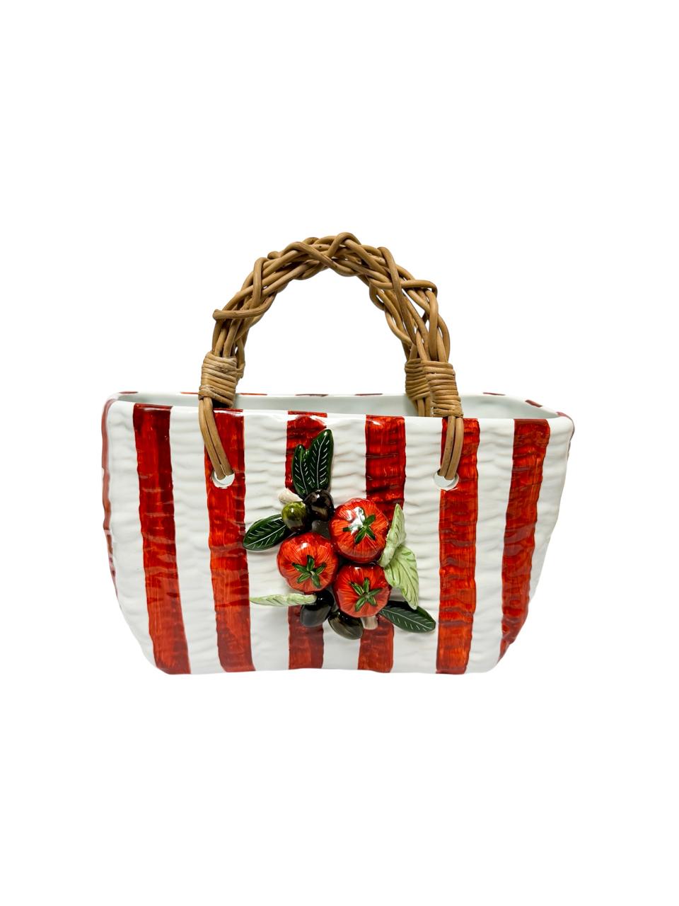 A Bolsinha em Cerâmica da Coleção Tomate Luiz Salvador é uma peça autêntica, charmosa e exclusiva, que une arte, design e funcionalidade. Inspirada no estilo artesanal característico da marca, apresenta acabamento pintado à mão com listras vermelhas e brancas, detalhe em tomates aplicados e alça trabalhada em efeito vime que reforça seu caráter decorativo.